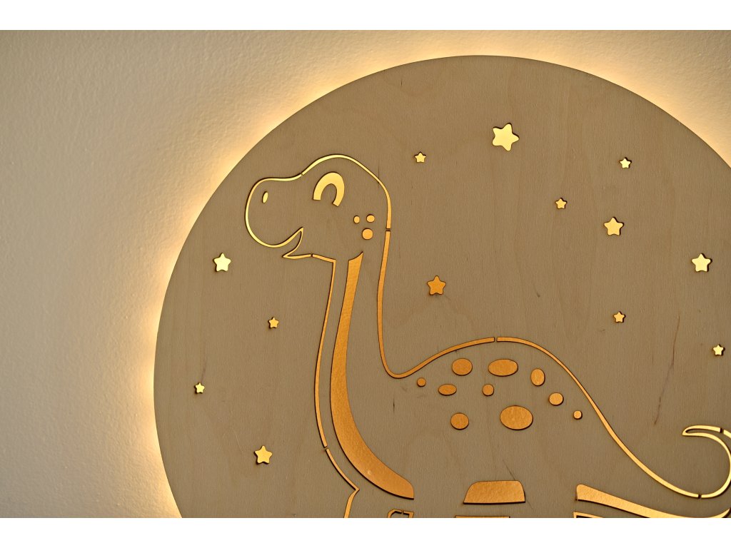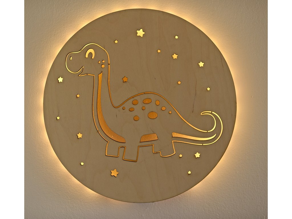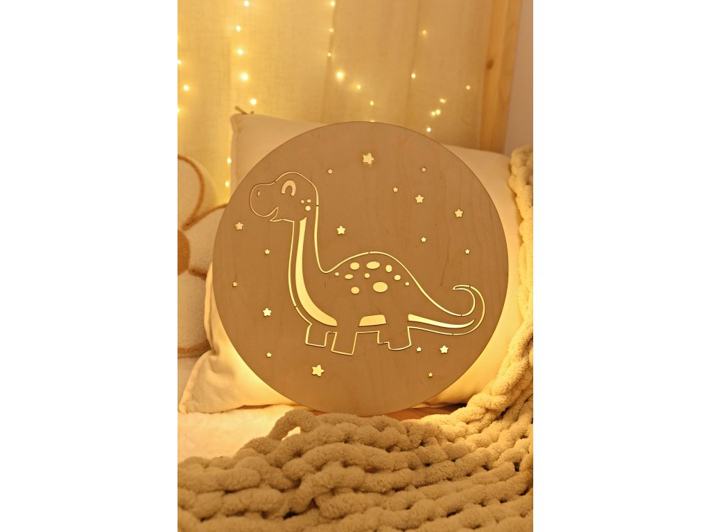 Dřevěné dětské světýlko s motivem brontosaura rozzáří pokojíček teplým uklidňujícím světlem.