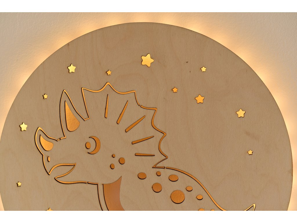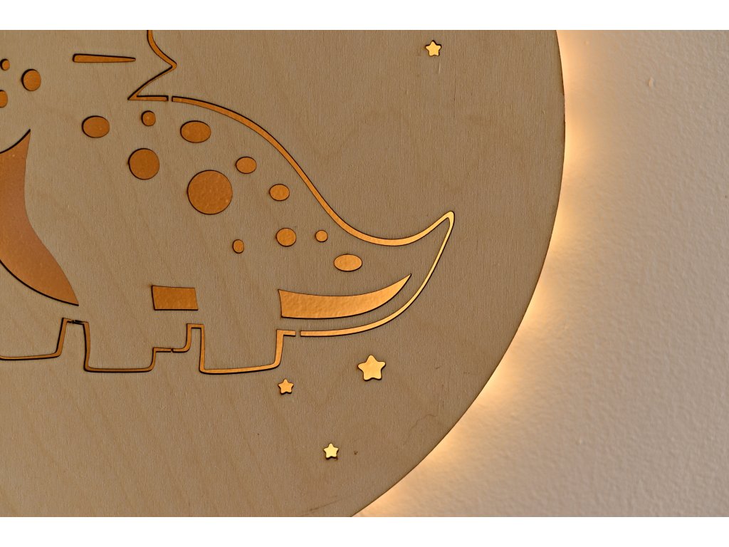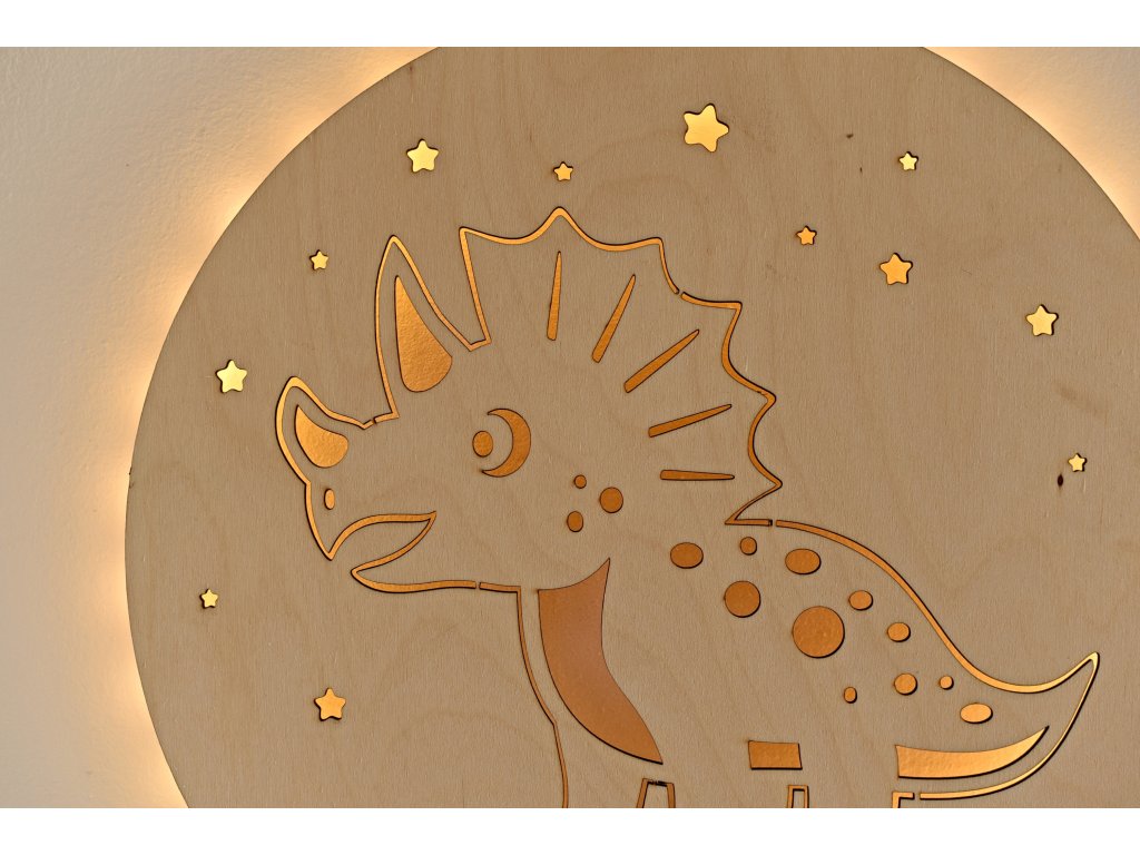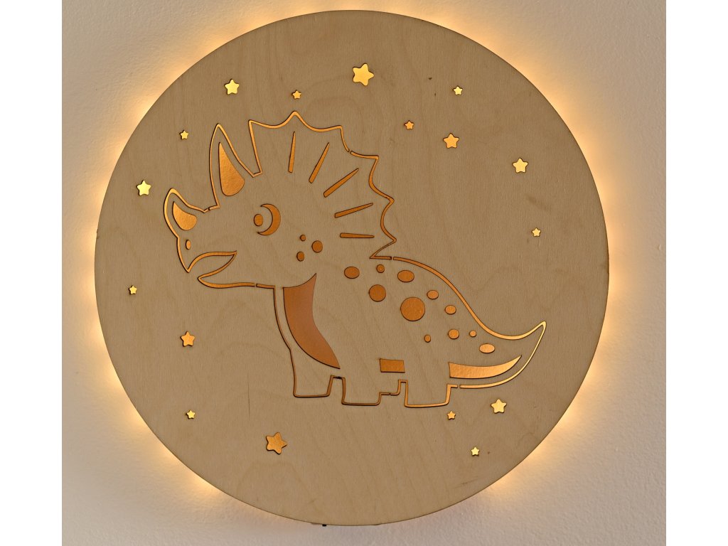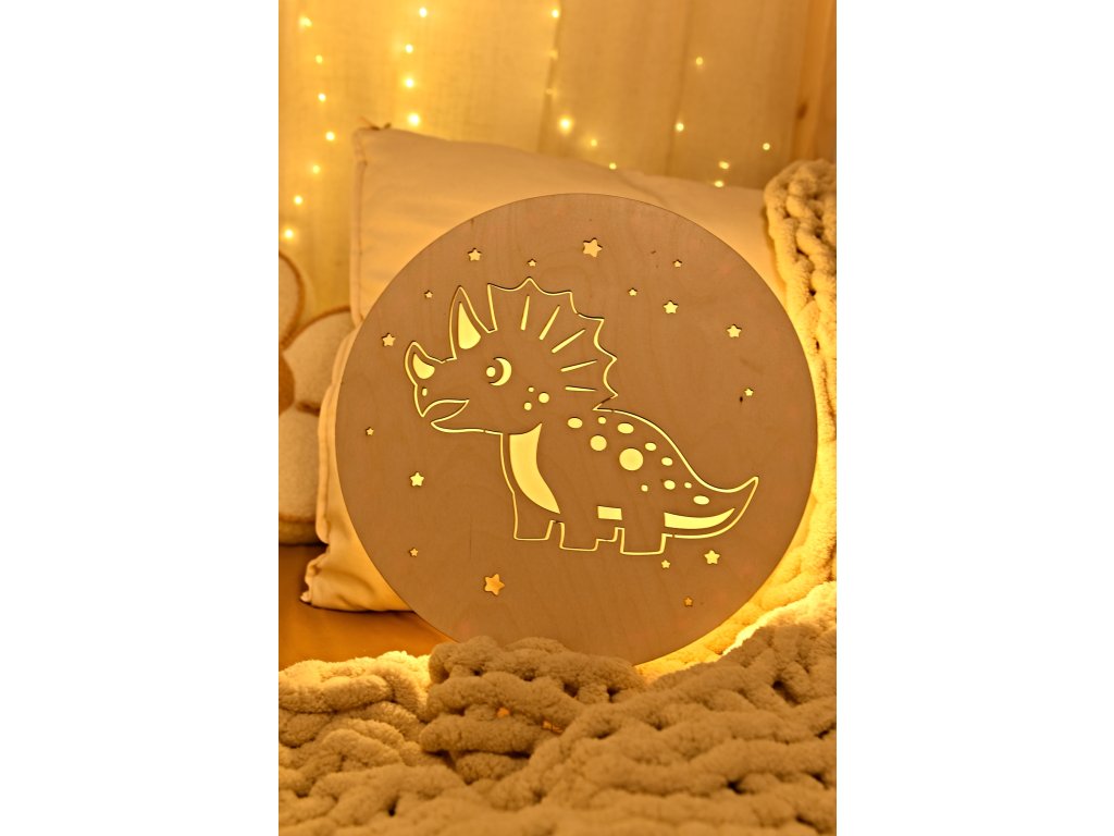Dřevěné světýlko s Triceratopsem rozzáří každý dětský pokojíček! Z březové překližky vyřezaný motiv jemně prosvítá teplým LED světlem a vytváří útulnou atmosféru před spaním.  Vhodné jako noční lampička při usínání, nebo četbě knížek před spaním