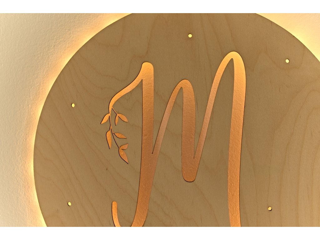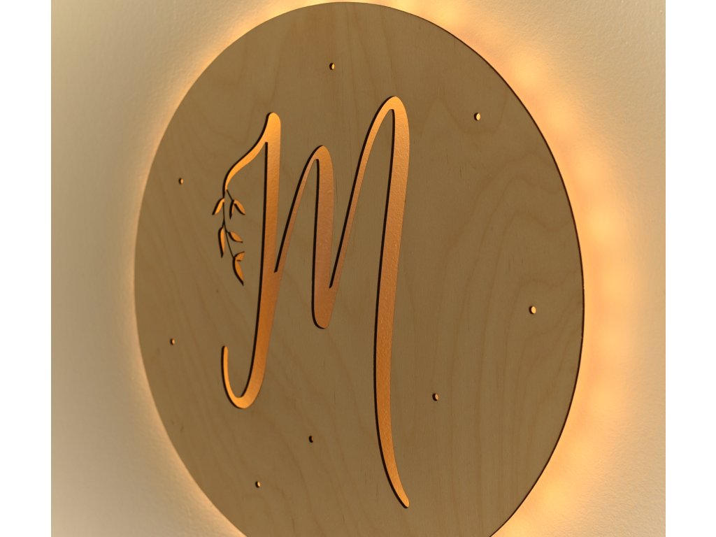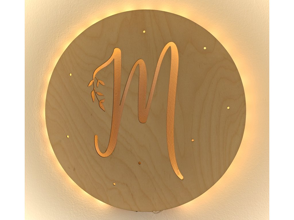 Dřevěné světýlko s písmenkem M a jemnými tečkami.