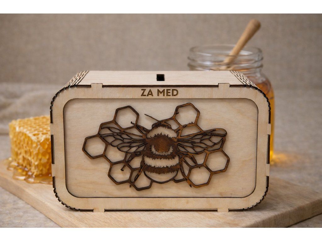 Originální dřevěná kasička „Za med“ je praktickým pomocníkem i milým doplňkem pro každého včelaře nebo milovníka domácího medu.