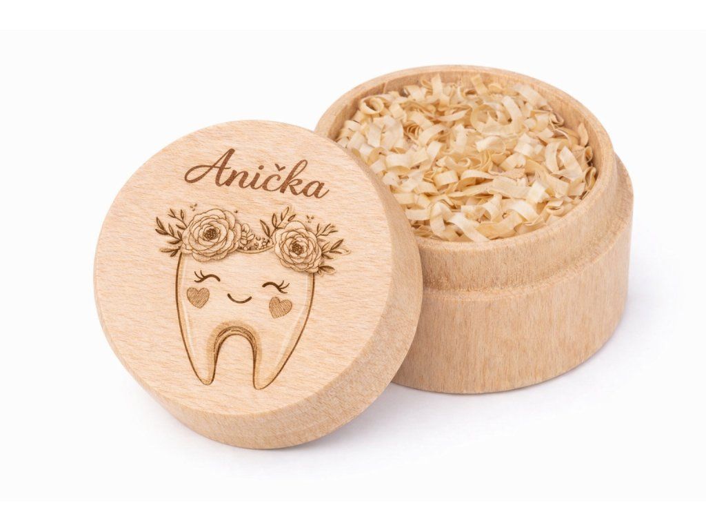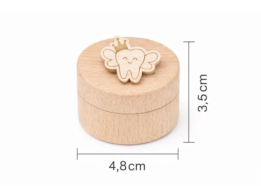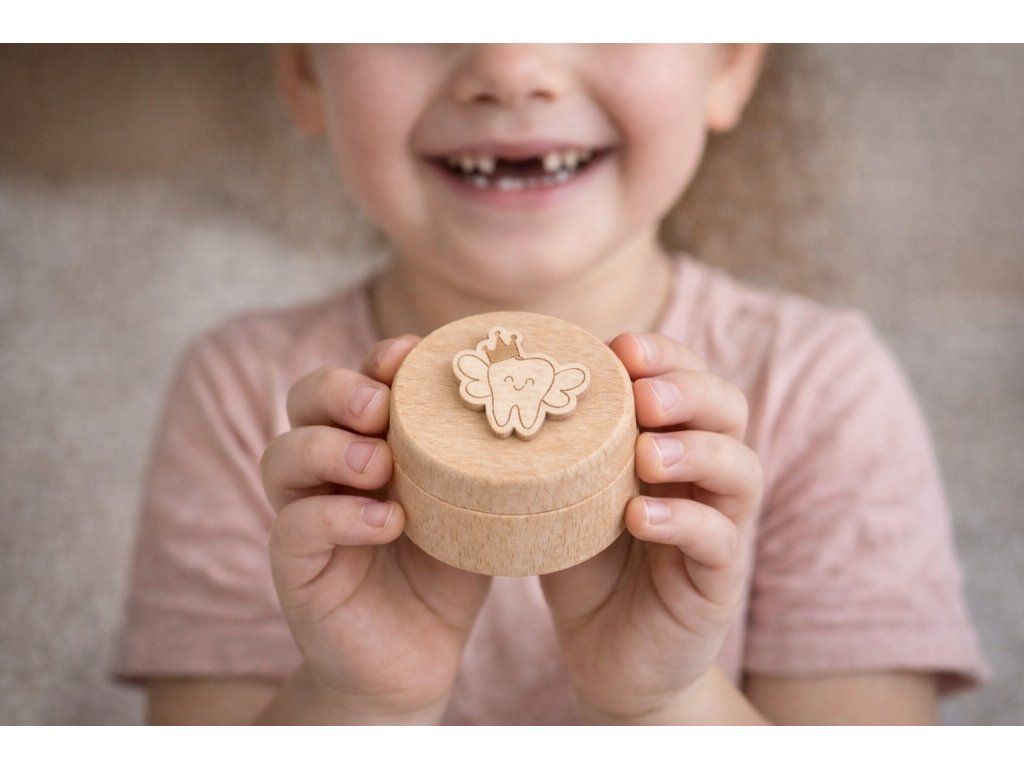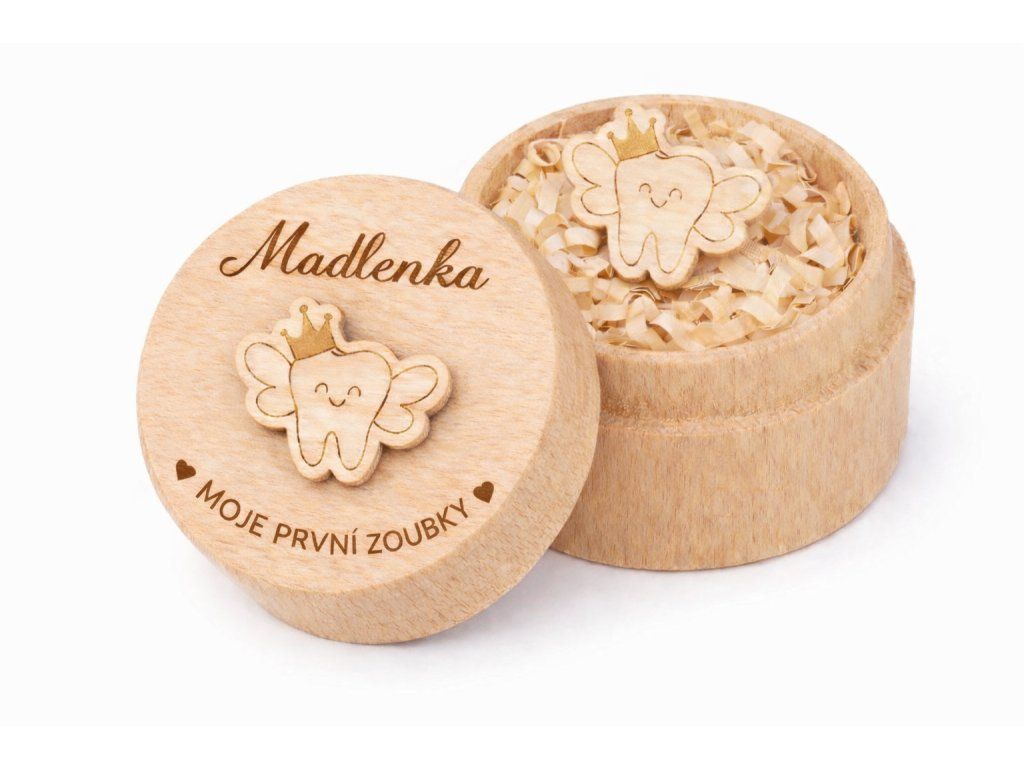 Krabička je vyrobena z přírodního dřeva a zdobená jemným dětským motivem. Díky možnosti doplnění jména dítěte se stává osobní památkou, která patří jen jemu. Je ideální nejen pro zoubkovou vílu, ale i jako milý dárek k prvnímu zoubku nebo k narození miminka.