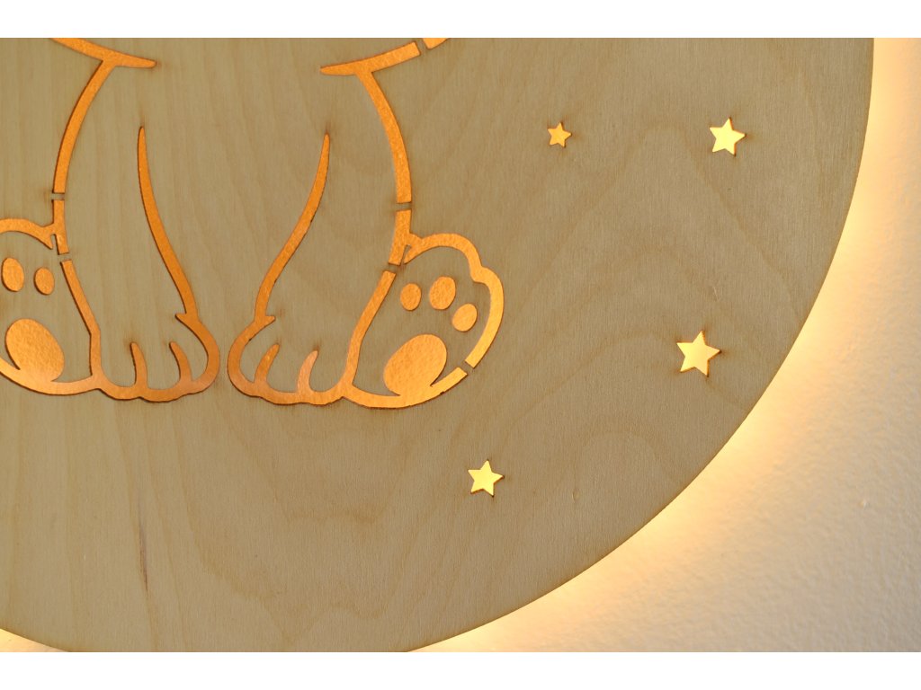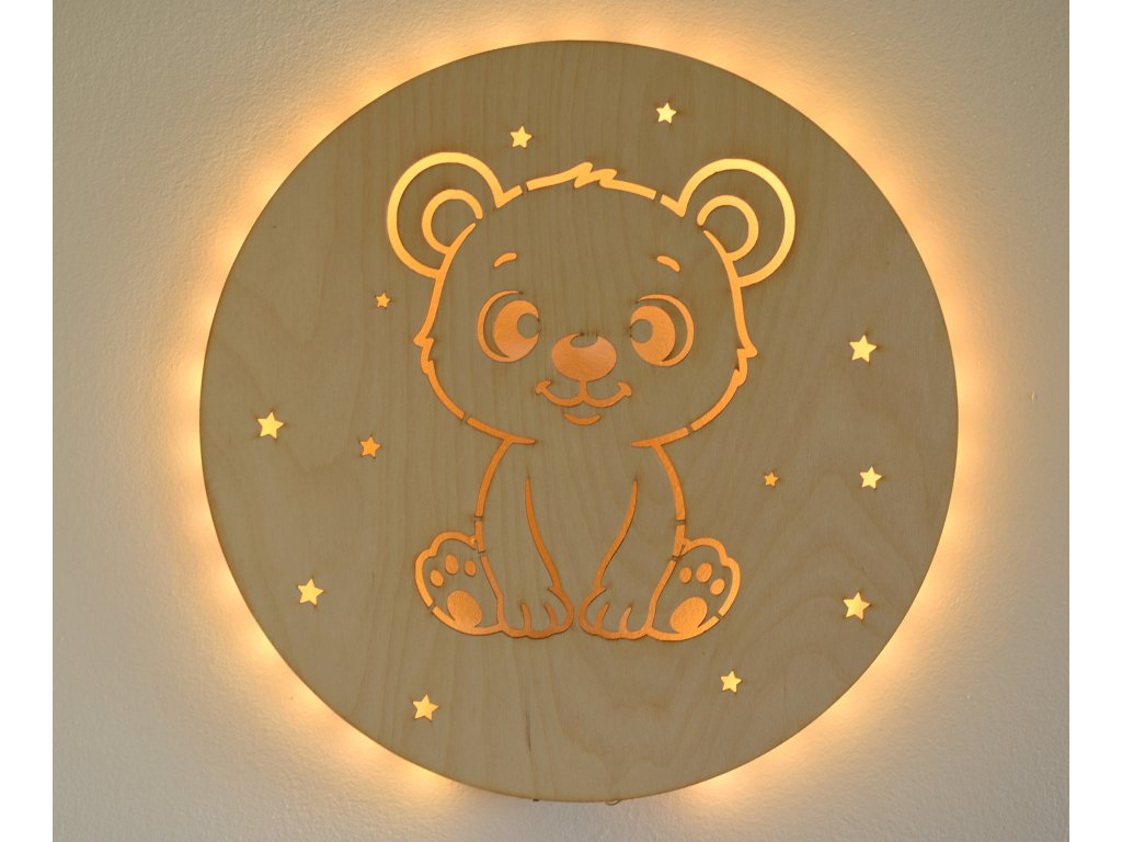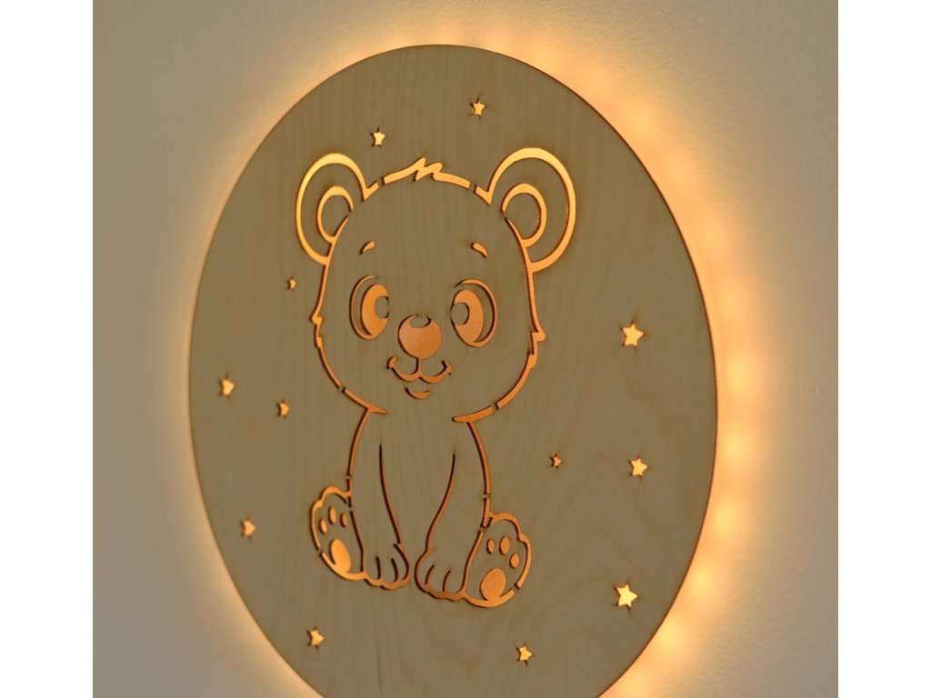Dřevěné světlo s motivem medvídka rozzáří dětský pokoj teplým světlem a vnese do něj klid a pocit bezpečí.
